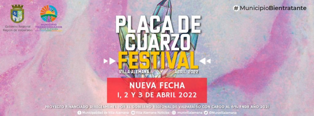“Placa de Cuarzo Festival” es una iniciativa que surgió desde el Municipio Transformador de Villa Alemana y que se puede realizar producto de la adjudicación del Fondo de Asignación Directa de Gobierno Regional de Valparaíso. Sin embargo, su concretización fue postergada por el bien de la salud de los vecinos y vecinas en el contexto de los aumentos de contagios de COVID-19 en el territorio nacional.