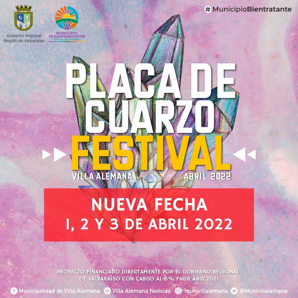 El evento “Placa de Cuarzo Festival”, organizado por la Municipalidad de Villa Alemana, fue postergado para el mes de abril, con el fin de proteger a los vecinos y vecinas de los aumentos de contagios de COVID-19 a nivel nacional.