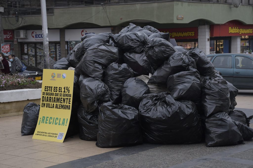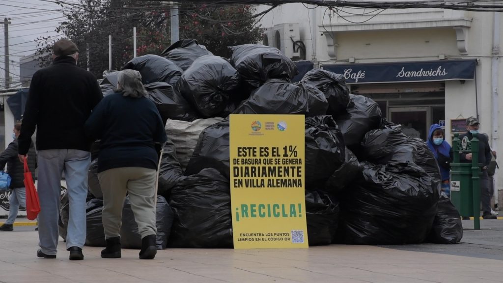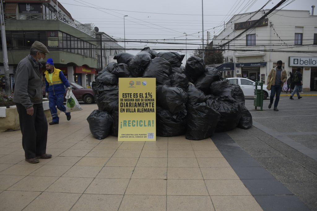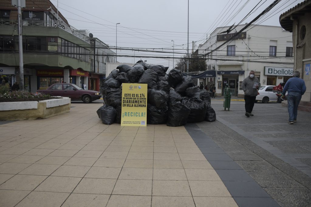 Información proporcionada en el marco de dos intervenciones en la Semana del Reciclaje, liderada por la Dirección Ambiental Municipal. Una de ellas, en pleno Paseo Latorre, mediante un montículo con 55 bolsas de basura apiladas con la inscripción “Este es el 1% de basura que se genera diariamente en Villa Alemana”.