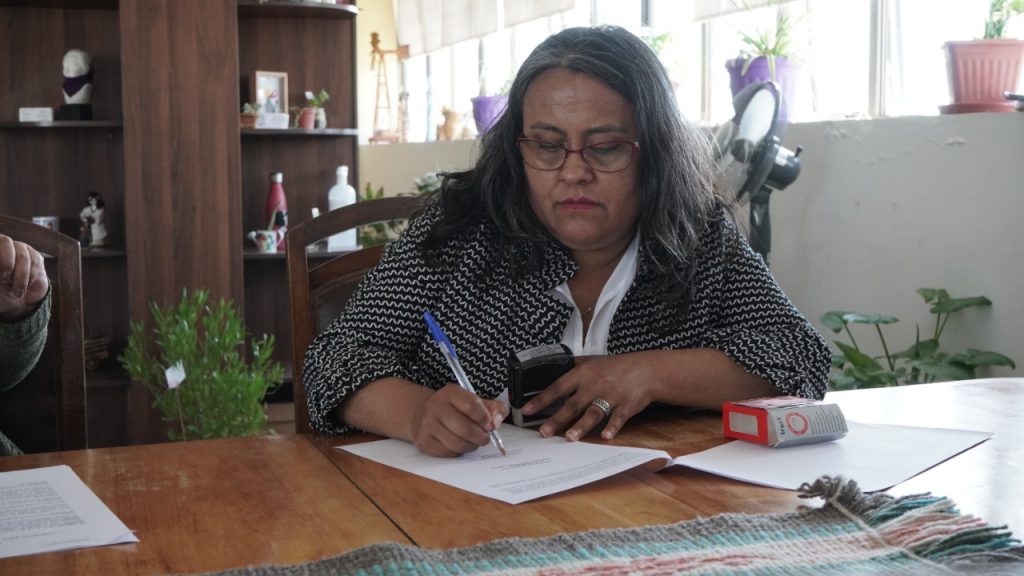 Soledad Vera, presidenta de la Junta de Vecinos Doña Francisca, firmó en representación de los vecinos y vecinas, emocionada de contar con infraestructura que fortalecerá la gestión comunitaria.
