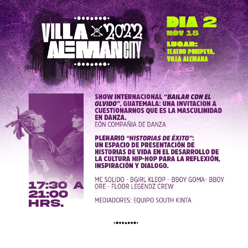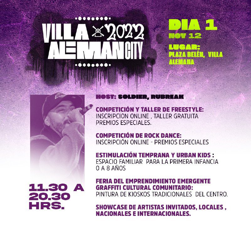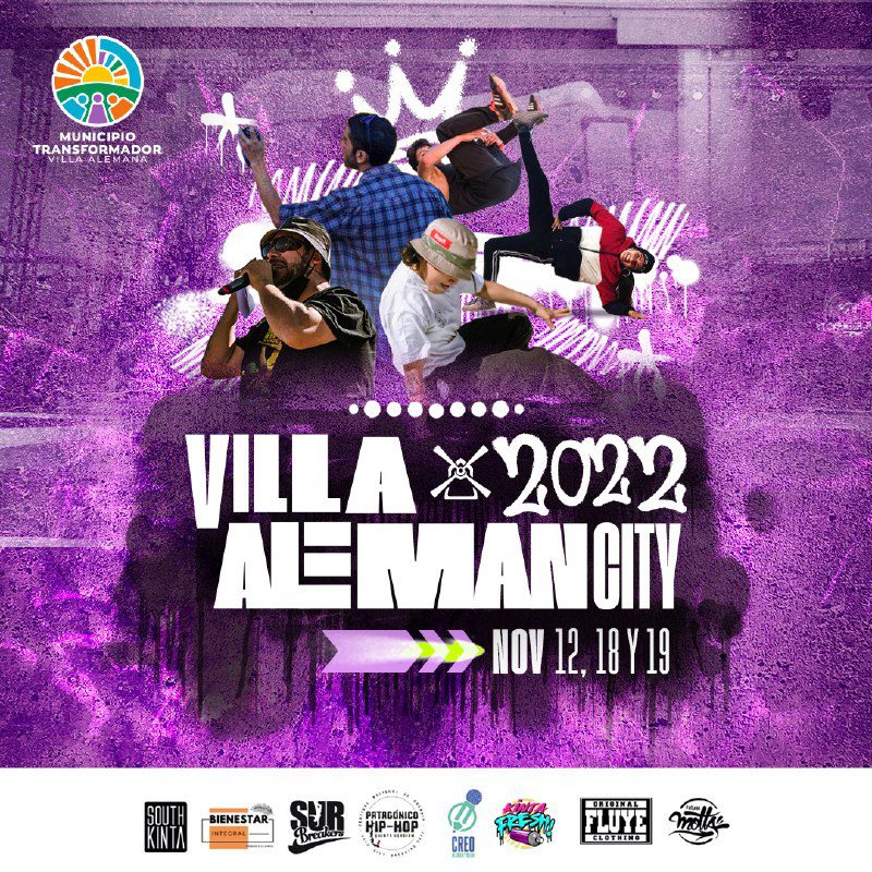 Este 12, 18 y 19 de noviembre se realizará el festival Villa Alemancity, que estará cargado de cultura, deporte y arte urbano, partiendo el primer día en la Plaza Belén, para seguir en el Teatro Pompeya y terminar en el Parque Roque Esteban Escarpa, actividades que promoverán aprendizajes pro sociales y de intercambio cultural formativo, competitivo y recreativo, así como valores propios del Hiphop y la cultura urbana.