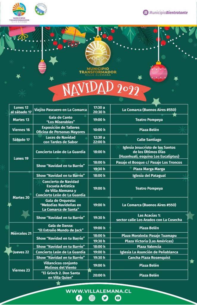 Llega diciembre y junto con ello las festividades de fin de año donde una de las fechas más esperadas por las familias es navidad. Por eso el Municipio de Villa Alemana preparó una completa parrilla de actividades para que los vecinos y vecinas puedan disfrutar y prepararse a la inminente llegada de esta fecha.