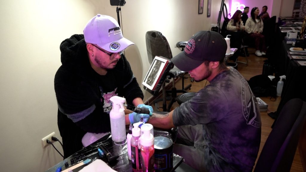 Y las sorpresas no terminaron allí; ya que los ojos estuvieron puestos sobre un trabajo colaborativo que duró siete horas. Del proceso participaron cuatro tatuadores que plasmaron, sobre una espalda completa, el diseño realista de una calavera con rosas.