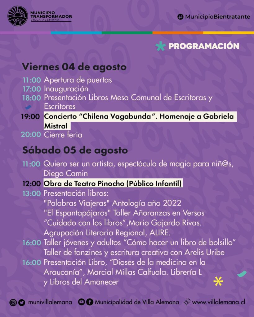 La fiesta literaria, iniciará el viernes 4 de agosto, cuya jornada contemplará el concierto de música “Chilena Vagabunda”, interpretado por artistas de Villa Alemana que musicalizaron poemas de Gabriela Mistral en honor de la poetisa.