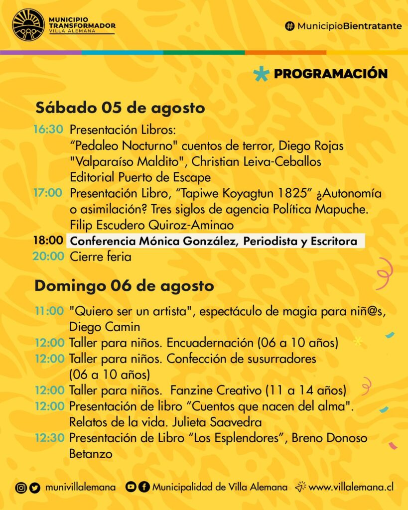 Por otro lado, el sábado 5 a las 18:00 horas, la invitación para la comunidad es a reflexionar, mediante una conferencia que dictará la periodista y escritora Mónica González a propósito que este año, Chile, conmemora 50 años del golpe militar.