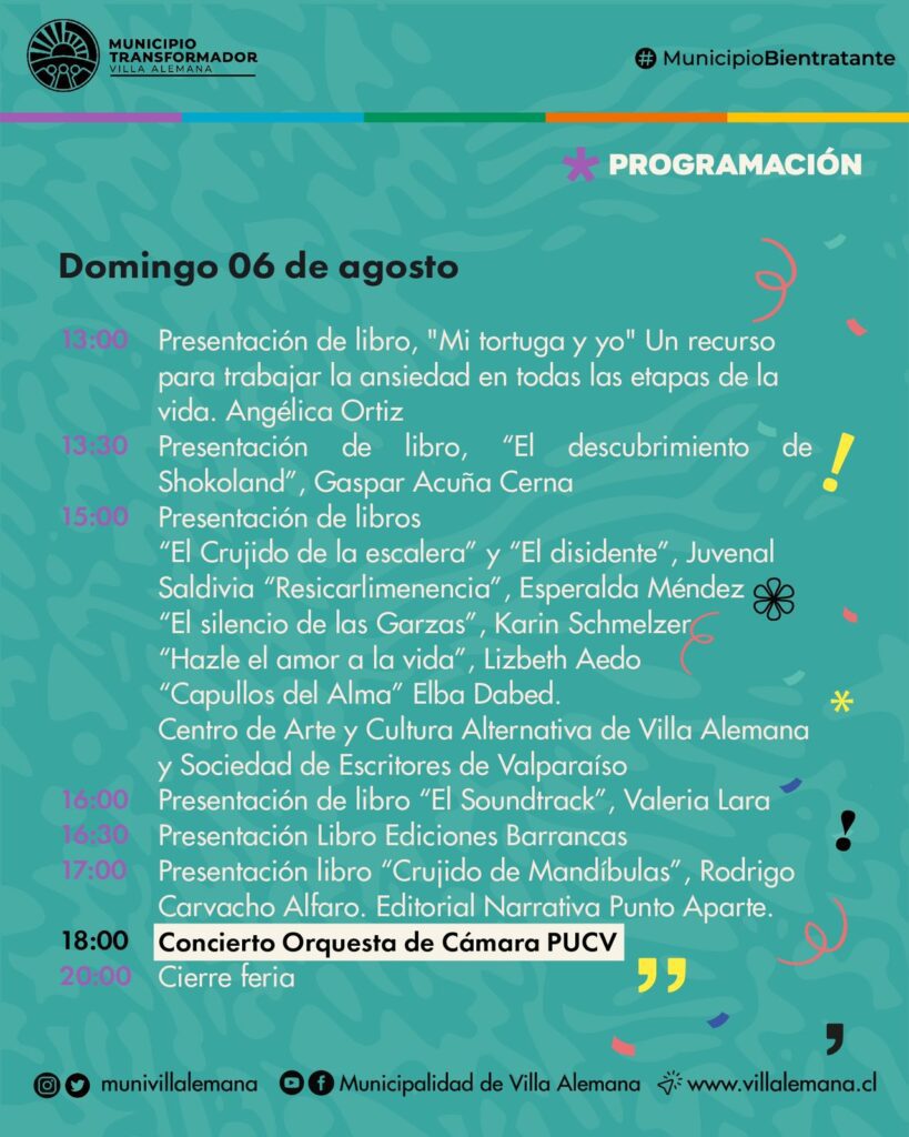 Una de las características más emblemáticas de la feria, aparte de fomentar el desarrollo lector en la ciudadanía, es precisamente su nutrida cartelera. Al respecto el encargado de cultura, Marcos Muñoz, refirió que «como ya es costumbre, la feria del libro de Villa Alemana le otorga un gran espacio a las editoriales pequeñas y a los niños y niñas, contribuyendo así, al fomento lector. Actividades como obras de teatro, talleres, presentaciones de libros por supuesto, y el concierto de cámara de Pontífice Universidad Católica de Valparaíso para el cierre, son las experiencias que podrán vivir en esta celebración.»
