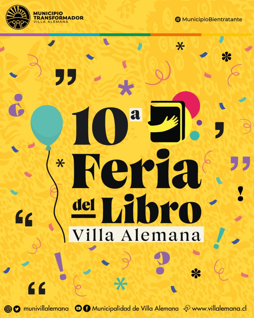 Villa Alemana ya está preparada para celebrar, con sus vecinos y vecinas, la esperada 10º Feria del Libro. Una actividad organizada por el departamento de cultura y patrimonio del Municipio Transformador, que gracias a los años de trayectoria acercando la lectura a la comunidad y visibilizando las editoriales independientes de la zona, se ha convertido en la fiesta literaria más importante de la comuna, convocando así, a miles de personas en todas sus versiones.