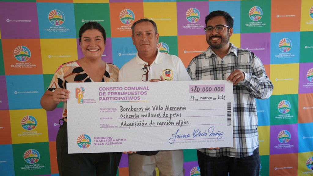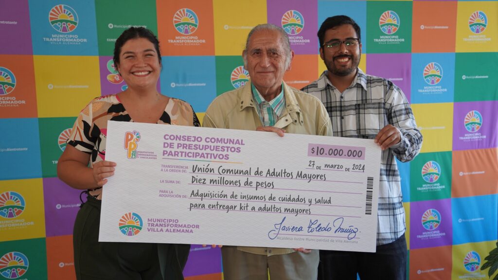Y este año, con los montos remanentes del programa, las organizaciones sociales de la comuna, junto a la Mesa Técnica Municipal, determinaron brindar aportes a cinco proyectos macro, que fueron entregados en una ceremonia realizada en el municipio de Villa Alemana, donde estuvo presente la alcaldesa de la comuna, Javiera Toledo, presidenta del Consejo de los Presupuestos Participativos; y el vicepresidente, Ignacio Ahumada, quienes entregaron los donativos a representantes del Cuerpo de Bomberos y de la Unión Comunal de Adultos Mayores (UCAM).
