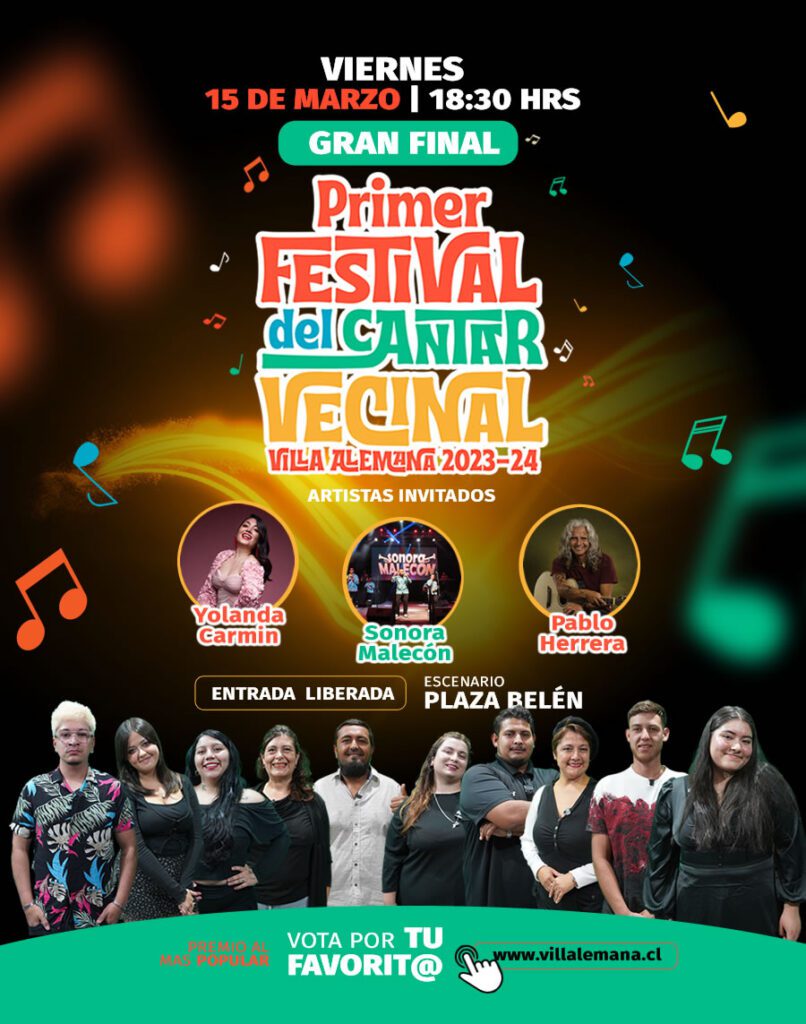 Tras cinco meses de preparación y procesos de selección, el Primer Festival del Cantar Vecinal de Villa Alemana llega a su esperada gran final, que se realizará el 15 de marzo, a las 18:30 horas, en el escenario de la Plaza Belén. Diez finalistas, hombres y mujeres de diversas edades y sectores de la comuna, lo darán todo en sus presentaciones para ser los ganadores del certamen.