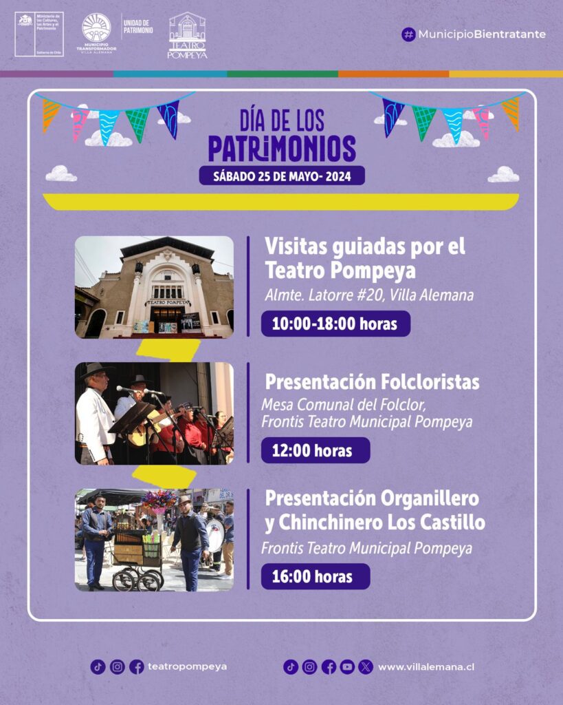 En detalle, se realizará la presentación de folcloristas de la Mesa Comunal del Folclor y la de organilleros y chinchineros en el Teatro Municipal Pompeya; talleres de cuentos y un encuentro creativo con Paul Castán en la Biblioteca Pública Municipal Paul Harris; exposiciones fotográficas, talleres de cianotipia e ilustración botánica en el Centro Cultural Gabriela Mistral; y una gran ruta patrimonial.