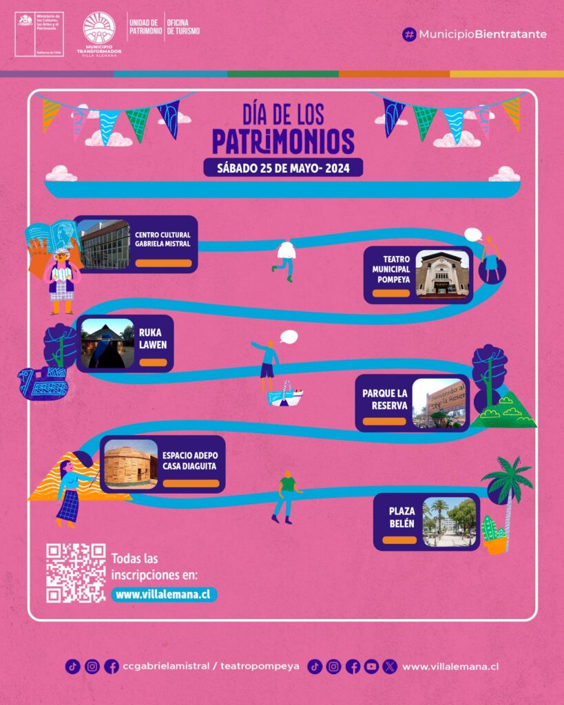 La jornada busca que los vecinos y vecinas, conozcan el patrimonio villalemanino y sean parte de las 15 actividades gratuitas que se realizarán desde las 10:00 hasta las 18:00 horas, en distintos puntos de la ciudad, donde la comunidad podrá asistir a visitas guiadas a lugares emblemáticos de la comuna, charlas, talleres, recorridos, actividades culturales y mucho más.