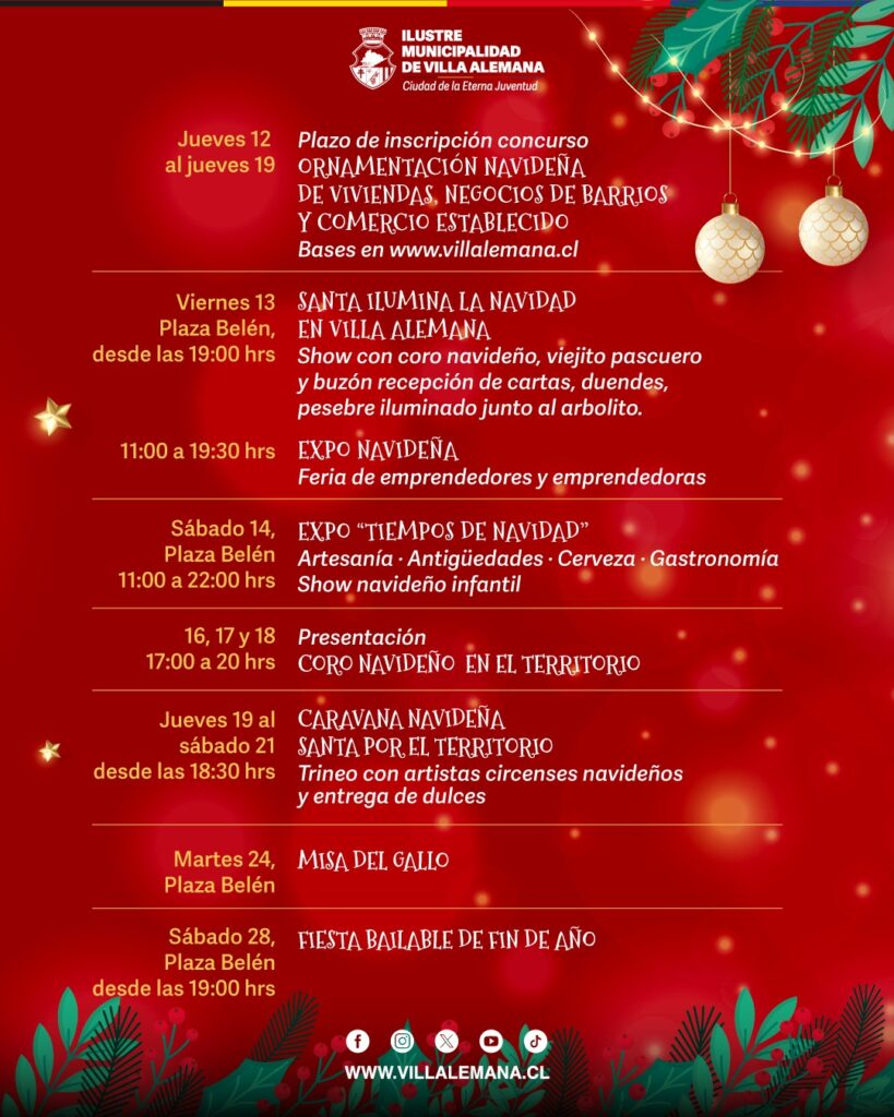 Con la llegada de diciembre, la Ciudad de la Eterna Juventud se prepara para celebrar la navidad, una de las fechas más esperadas por las familias y para hacer de esta temporada un momento especial, el Municipio de Villa Alemana organizó una nutrida agenda de actividades que incluyen villancicos territoriales, ferias de emprendedores, misa del gallo, concurso de ornamentación y una fiesta bailable de cierre de año.