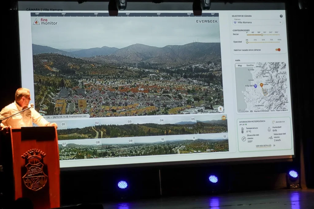 En la presentación fue el propio Cantwell quien explicó las motivaciones y el funcionamiento de la gobernanza tras el proyecto, mientras que Fritz Lübbe, director Everseek, empresa a cargo de la operación técnica del sistema, detalló el funcionamiento de esta plataforma líder en detección temprana y análisis de incendios forestales mediante Inteligencia Artificial, exhibiendo imágenes reales captadas por las cámaras, su capacidad de reacción, el funcionamiento del sistema de alertas y los beneficios que estas tecnologías aportan a la gestión de riesgos en la región.