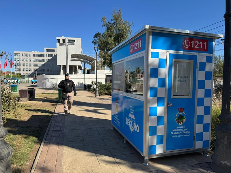 Durante la tarde del lunes 20 de abril, la Municipalidad de Villa Alemana instaló la segunda caseta de Seguridad Pública de la comuna, ubicada en el Parque Cívico Belén, sumándose a la primera implementada en diciembre pasado en el Paseo Latorre. La caseta comenzó a operar de inmediato con guardias tácticos, resguardando el perímetro de la plaza.