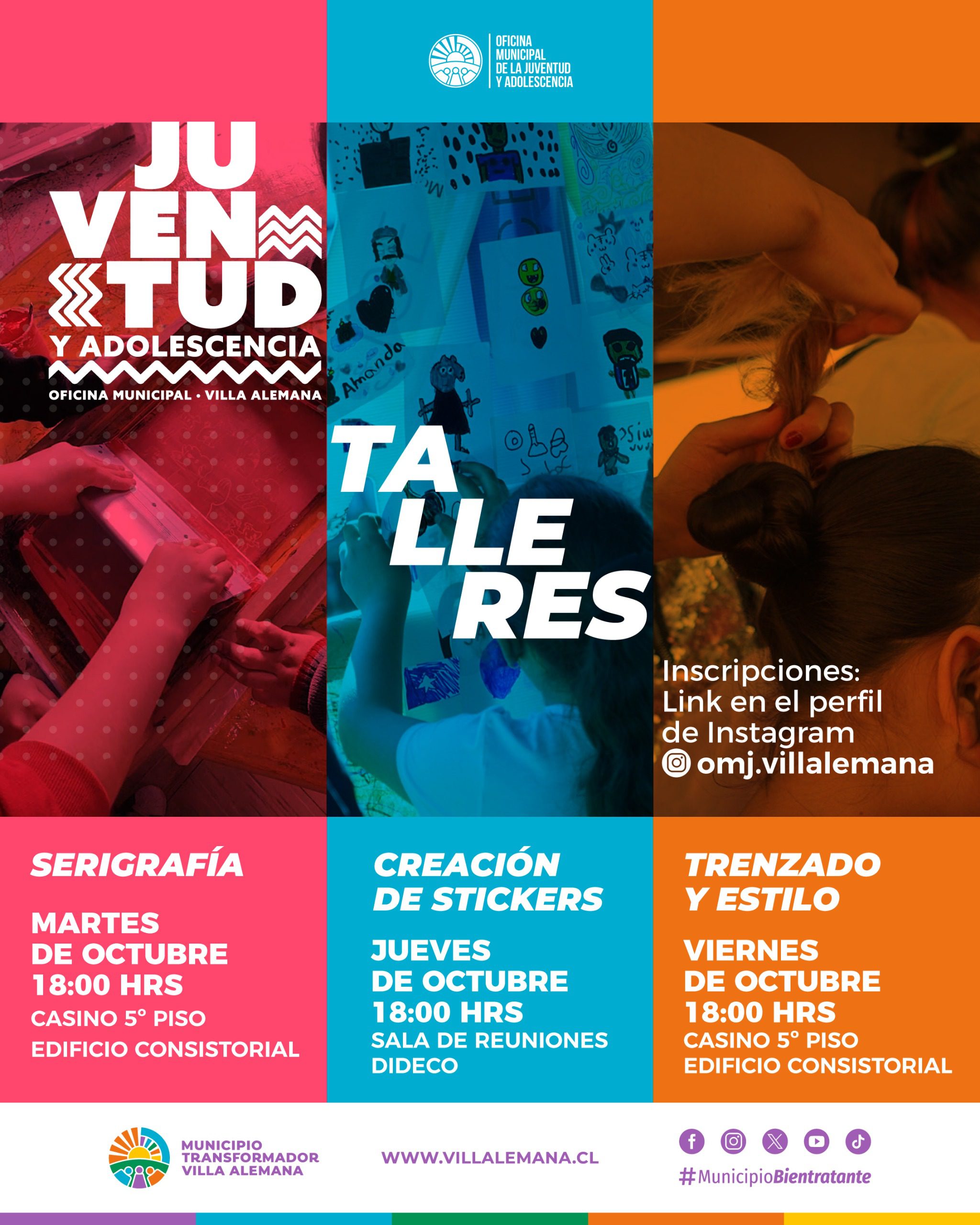 Hola, te invitamos a participar de los talleres gratuitos que la Oficina Municipal de la Juventud de Villa Alemana tiene para ofrecer durante el mes de octubre!
