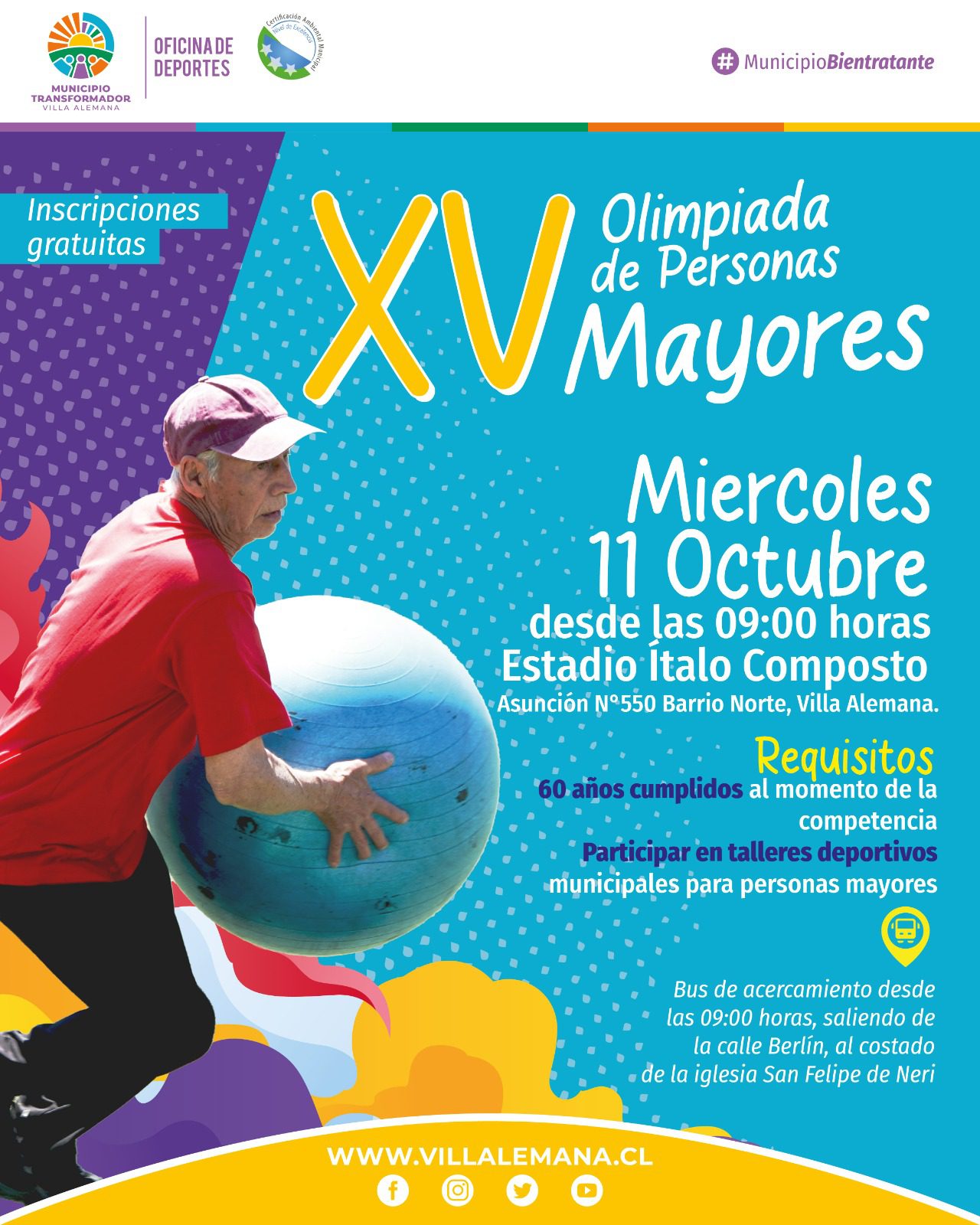 El próximo miércoles 11 de octubre a las 9:00 horas viviremos la quinceava versión de las Olimpiadas de Personas Mayores en el Estadio municipal Ítalo Composto, ubicado en la calle Asunción 550.