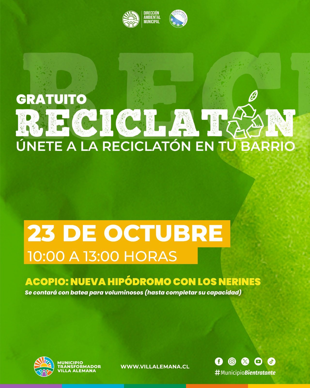 ♻️ ¡Seguimos reciclando! Nos vemos este miércoles 23 de octubre en Nueva Hipódromo tendremos un nuevo operativo de Reciclatón. ¡Te esperamos entre las 10.00 y las 13.00 hrs!