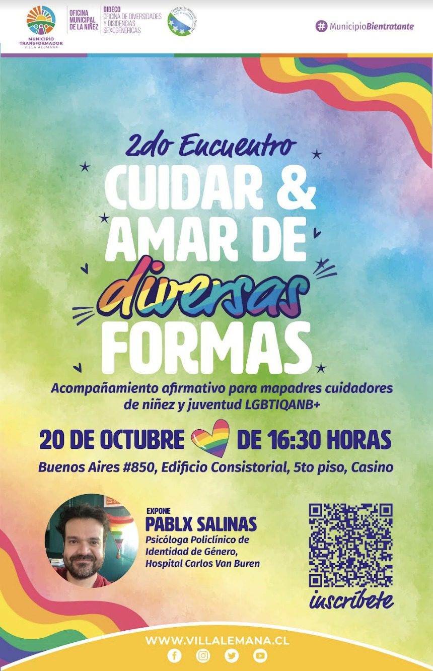 La Municipalidad de Villa Alemana, a través de la oficina de Diversidades y Disidencias Sexogénericas, te invita al segundo encuentro «Cuidar y Amar de Diversas Formas». Una instancia de acompañamiento afirmativo para madres, padres y cuidadores de niñez y juventud LGBTIQANB+ que se realizará de forma gratuita el próximo viernes, 20 de octubre, en el quinto piso del Edificio Consistorial, Buenos Aires 550.