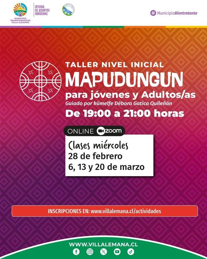 Este taller de nivel básico de mapudungun se realiza en el contexto del Día Internacional de las lenguas maternas. Las clases serán vía zoom entre las 19:00 y 21:00 horas los días miércoles 28 de febrero y 6, 13 y 20 de marzo, guiadas por la kümelfe Débora Gatica Quileñán.